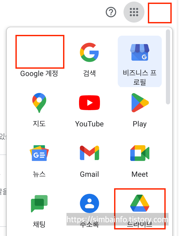 구글 페이지에서 로그인 후 우측상단에 9개의 점을 클릭하면 이렇게 목록이 나온다. 여기서 드라이브를 클릭한다.