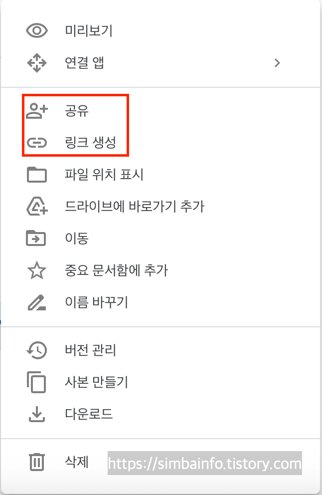 공유하고자 하는 파일을 우측클릭 후 공유 또는 링크 생성을 클릭한다.
